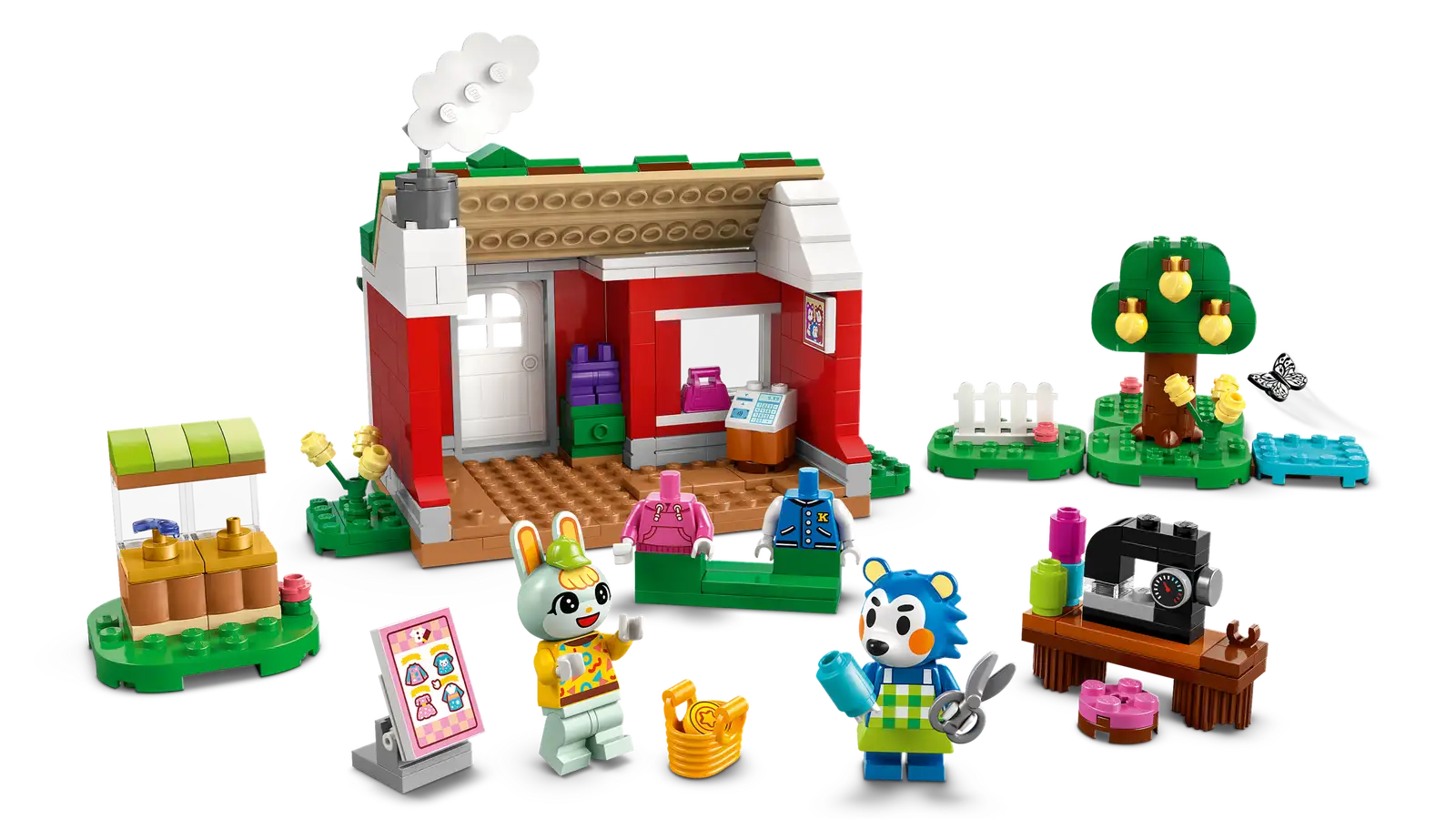This pretend shop playset comes with Animal Crossing minifigures Mabel, a hedgehog, and Sasha, a rabbit. Kids can help Sasha pick some new clothes and pretend to alter the outfit with the scissors and sewing machine to make itfit perfectly or head to the stall outside to finish their outfit off with the perfect accessory, paying for it with Bells, just like in the video game.