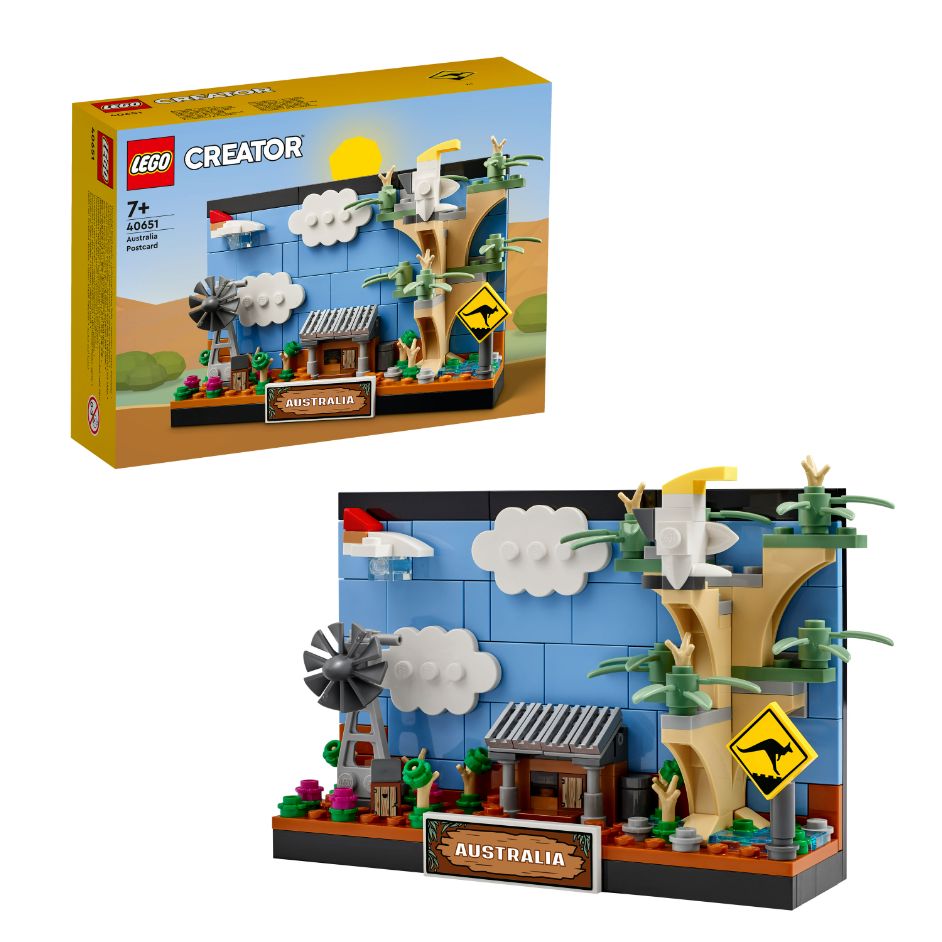 - Enjoy the sights – LEGO® Australia Postcard (40651) features some of the outback’s most famous sights: a shed, windmill, eucalyptus tree, desert flowers and a cockatoo