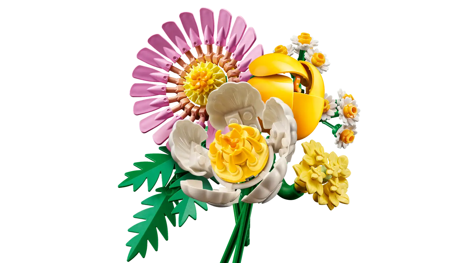 - LEGO® flowers – The bouquet blooms with 6 species of spring flowers in pastel shades, including Billy buttons, bluebells, Cleopatra ferns, yellow yarrows, a gerbera, a peony and a tulip